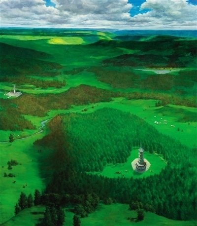 河北塞罕壩林場,是“三北”工程建設(shè)的重要區(qū)域?;脑兞趾5娜眽纹孥E,成為近年來主題性美術(shù)創(chuàng)作的重要課題。入選“筑夢——我們的新時代美術(shù)攝影作品展”的譚智群油畫《美麗的塞罕壩》,是在實地寫生基礎(chǔ)上的藝術(shù)提煉和情感升華。作者以俯視的構(gòu)圖,鋪展?jié)M目蒼翠的美景。畫面左側(cè),清澈的河流蜿蜒向前;畫面右側(cè),白色的雁群逐綠翱翔;遠(yuǎn)方,茂密的森林不斷延伸,風(fēng)力發(fā)電機林立于山巔,畫面充滿生機與活力。同樣以俯視的角度處理構(gòu)圖,孔亮油畫《美麗中國——塞罕壩》則以塞罕壩林場和塞罕塔為視覺中心,蔥蘢的綠意,將意境渲染得更加深邃。翁凱旋油畫《滄海桑田——塞罕壩的前世今生》,通過三聯(lián)畫的形式,在新舊對比中構(gòu)建時空長廊,描繪出塞罕壩的時代變遷。
