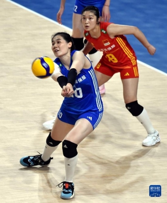 6月16日,中國(guó)隊(duì)球員王云蕗(前)在比賽中墊球。新華社記者 盧炳輝 攝