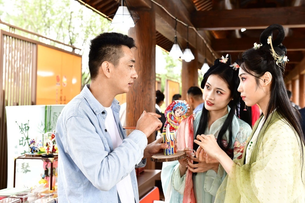 2023年9月26日,在第九屆尼山世界文明論壇“山東手造”精品展區(qū),與會(huì)人員在介紹國家級(jí)非遺曹州面人作品。新華社記者 郭緒雷 攝