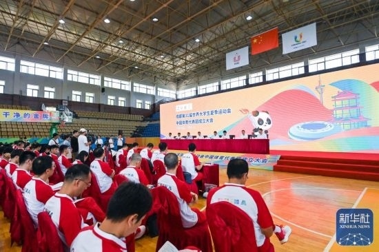第31屆世界大學(xué)生夏季運(yùn)動(dòng)會(huì)中國(guó)代表團(tuán)部分成員合影。 新華社記者 顏麟蘊(yùn) 攝