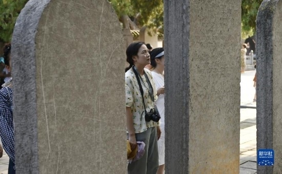 8月7日,游人在嵩陽書院內參觀“大唐嵩陽觀紀圣德感應之頌碑”。