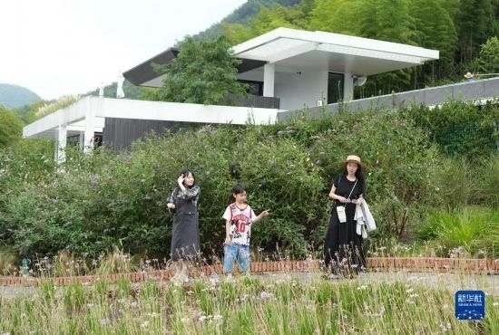 8月8日,游客在余姚市鹿亭鄉(xiāng)一家民宿的花園內觀光。