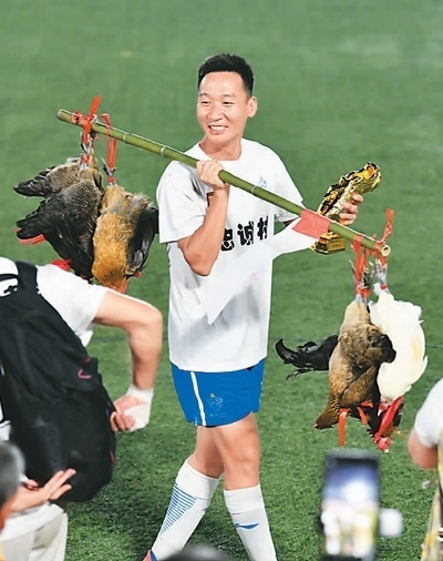參賽球員展示“村超”最佳射手獎(jiǎng)品——榕江小香雞。
