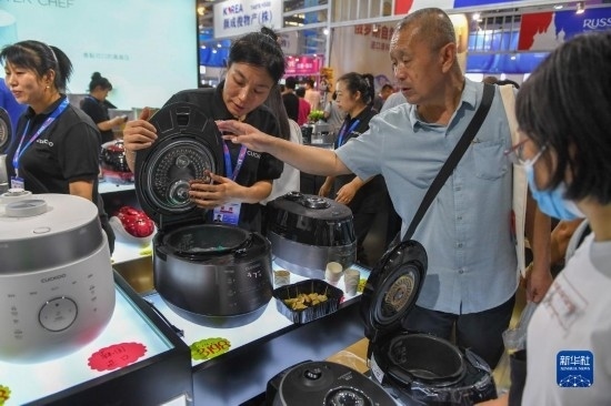 8月23日,在第十四屆中國(guó)—東北亞博覽會(huì)東北亞商品館,參展商向參觀(guān)者介紹韓國(guó)電器。