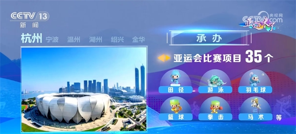 杭州設(shè)42個(gè)競(jìng)賽場(chǎng)館、主亞運(yùn)村及2個(gè)亞運(yùn)分村,承辦田徑、游泳、羽毛球、籃球、拳擊、馬術(shù)等35個(gè)亞運(yùn)會(huì)比賽項(xiàng)目和22個(gè)亞殘運(yùn)會(huì)比賽項(xiàng)目。