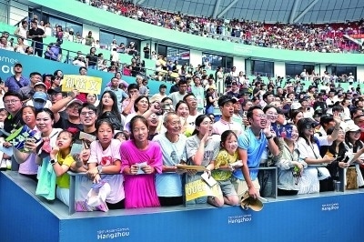 9月29日,杭州亞運會網(wǎng)球女子單打決賽現(xiàn)場,觀眾在歡呼。本報記者陳城攝 光明圖片