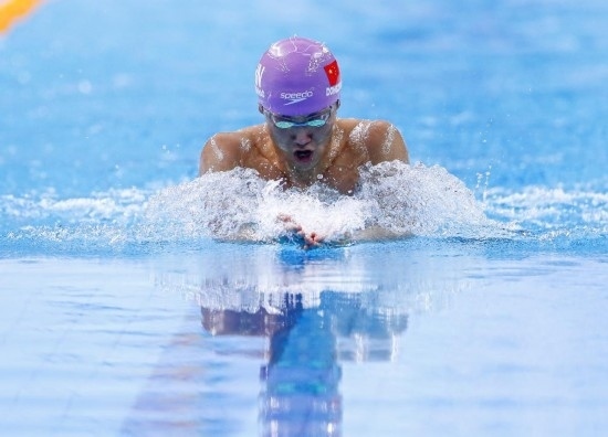 11月1日,南京市選手董志豪在比賽中,他獲得男子100米蛙泳公開組冠軍。當日,第一屆全國學生(青年)運動會游泳項目比賽在廣西南寧開賽。新華社記者 胡星宇 攝