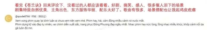2023年前后,網(wǎng)劇《點燃我,溫暖你》和《長月燼明》發(fā)行至越南,迅速占據(jù)Vieon等越南本地視頻平臺首位。越南觀眾在評論區(qū)內(nèi)毫不吝嗇自己的喜愛:“我已經(jīng)看了第二遍,每次都會哭?!薄八畜@人的演員陣容、服裝、風景,簡直太完美了!”