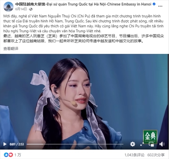 中國駐越南大使館Facebook發(fā)文點贊越南藝人芝芙在《乘風2023》傳播中越文化。