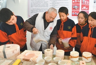 湖北通城的陶瓷非遺傳承人向?qū)W生們傳授陶藝制作技藝。劉建平攝(人民視覺)