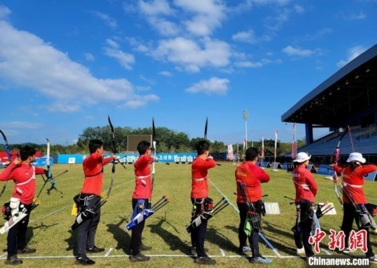 國家體育訓練南方基地(海南白沙·綜合),國家射箭隊紅隊在進行一場隊內(nèi)賽。 中新網(wǎng)記者 王曉斌 攝