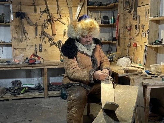 從將軍山滑雪場(chǎng)駕車一路向北,20分鐘左右就到了拉斯特鄉(xiāng)。記者到訪時(shí),69歲的斯蘭別克·沙和什和兒子胡安什別克·斯蘭別克正在作坊里制作毛皮滑雪板。