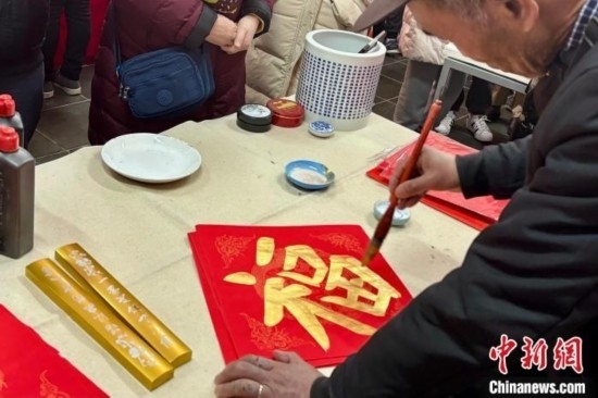 2月10日,大年初一,北京廠甸廟會(huì)開門迎客。圖為書法家為市民和游客寫福、送福。中新社記者 徐婧 攝