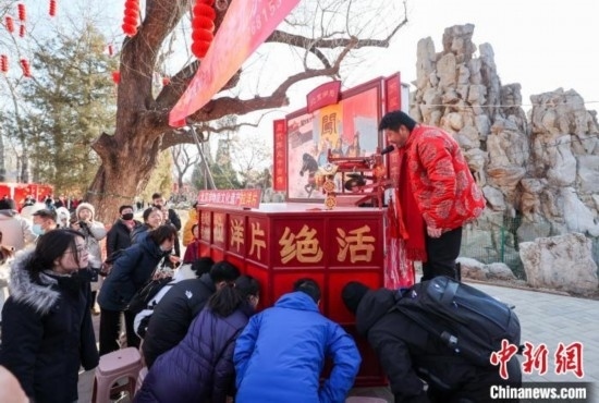 2月10日,大年初一,第三十八屆龍?zhí)洞汗?jié)文化廟會(huì)在北京龍?zhí)豆珗@開門迎客。圖為市民和游客在廟會(huì)上觀看老北京絕活“拉洋片”。中新社記者 賈天勇 攝