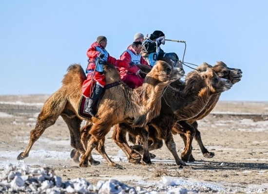 茫茫草原能賽馬,茫茫沙漠就能賽駱駝。2023年底在阿拉善右旗舉行的阿拉善萬峰駝那達(dá)慕大會上,設(shè)置了駱駝短距離速度賽、長距離耐力賽、接力賽等,還有駝球表演賽。按照當(dāng)?shù)啬撩竦恼f法,賽駱駝就得在冬天,因?yàn)槎斓鸟橊勛钇痢?/p>