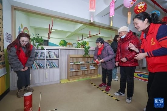 2月22日,在飛英街道吉北社區(qū)活動室里,黨員志愿者帶著老人玩投壺游戲。