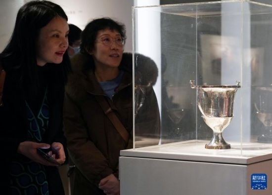 3月14日,媒體人員在觀看參展作品《帶著微笑的康塔羅斯酒杯》。