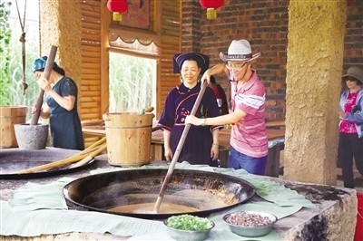 游客在景區(qū)體驗古法手工紅糖制作工藝。 韋芳蘭攝 |