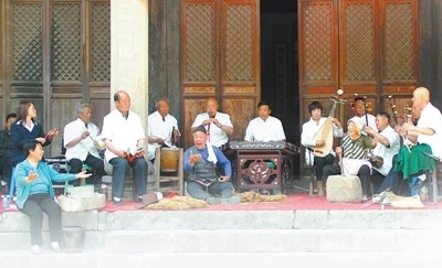 有靜也有動。如今,村中常有當(dāng)?shù)卮迕窈头沁z傳承人自發(fā)組織的“中莊秧歌”“打鐵花”等非遺演出,吸引不少游客。在司徒第院內(nèi),樹齡超400年的臘梅依舊枝繁葉茂。樹下,一位穿著白大褂、扎著白頭巾的老漢與一旁穿著紅襖藍裙的老太太一同上場,來到院內(nèi)的月臺上,一唱一和,用晉城方言演起了節(jié)目。這是村民崔有正、牛玉鳳夫婦,他們曾經(jīng)是部隊文藝骨干,現(xiàn)在利用閑暇表演。