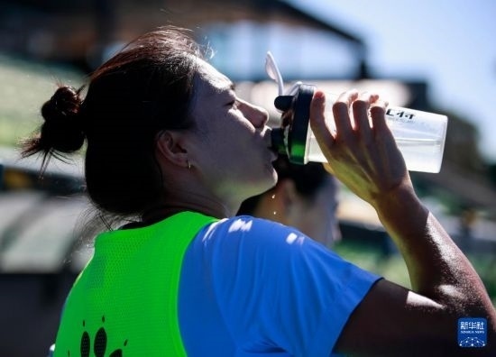 4月26日,中國女曲隊(duì)球員谷丙鳳在集訓(xùn)間隙補(bǔ)充水分。新華社記者 馬平 攝