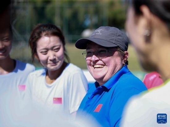 4月26日,中國女曲隊(duì)主教練安南(右二)在訓(xùn)練中與隊(duì)員溝通。新華社記者 馬平 攝