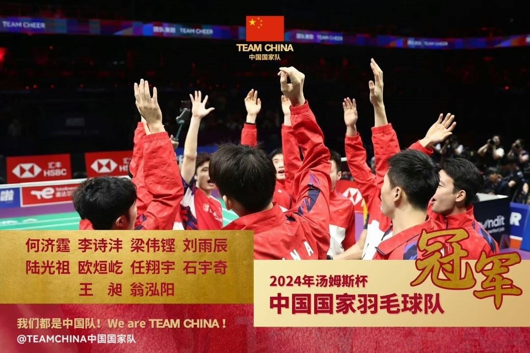 2024年湯尤杯賽5月5日在四川成都迎來(lái)收官日。在剛剛結(jié)束的湯姆斯杯決賽中,由石宇奇、梁偉鏗/王昶、李詩(shī)灃、何濟(jì)霆/任翔宇出場(chǎng)的中國(guó)男隊(duì)以總比分3-1戰(zhàn)勝印尼男隊(duì),重奪冠軍!
