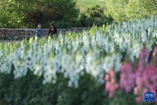 5月11日,游客在大連英歌石植物園游覽拍照。