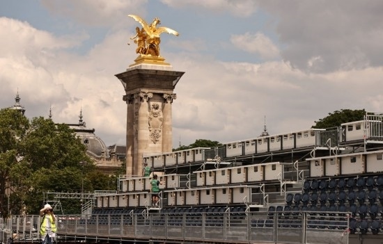 這是6月4日在位于法國(guó)巴黎市中心的亞歷山大三世橋拍攝的臨時(shí)比賽場(chǎng)地搭建現(xiàn)場(chǎng)。新華社記者 高靜 攝