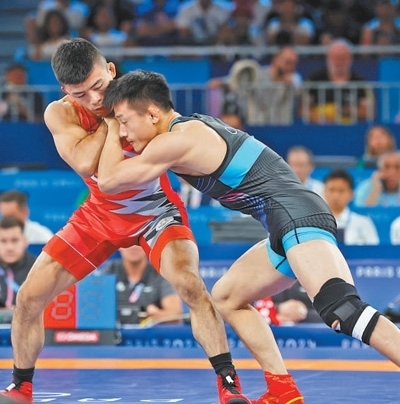 當地時間8月6日,中國隊選手曹利國(右)在巴黎奧運會男子古典式摔跤60公斤級決賽中。環(huán)球時報記者 李 昊攝