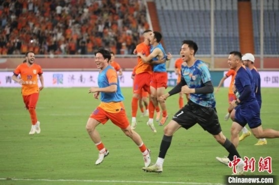 山東泰山隊點(diǎn)球大戰(zhàn)取勝,隊員沖進(jìn)場內(nèi)慶祝。中新社發(fā) 陳陽 攝