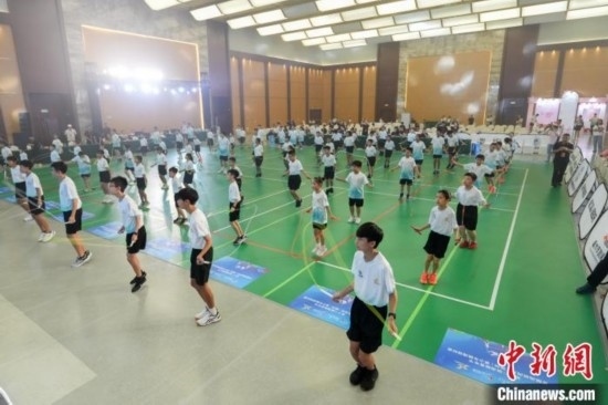 8月13日,首屆海峽兩岸(福州)青少年跳繩錦標賽開賽,選手正在進行賽前熱身百人跳。 包華 攝
