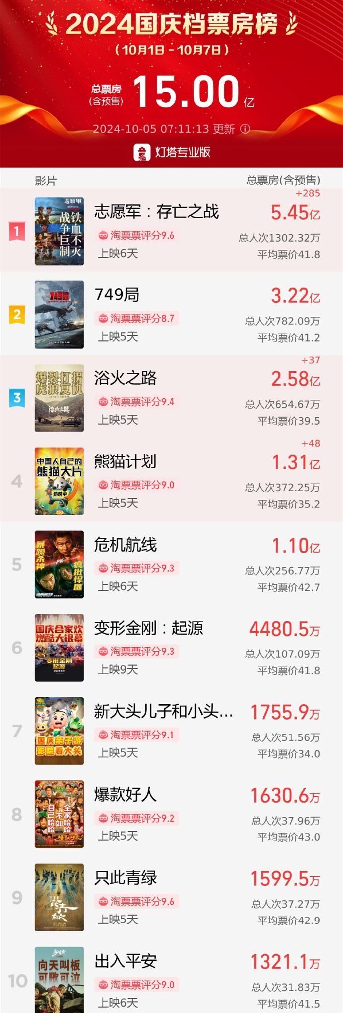 央視網(wǎng)消息:據(jù)網(wǎng)絡(luò)平臺(tái)數(shù)據(jù),截至10月5日7時(shí)11分,2024年國(guó)慶檔(10月1日—10月7日)檔期內(nèi)總票房(含預(yù)售)突破15億。