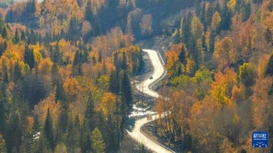 這是10月1日在新疆阿勒泰拍攝的阿禾公路沿途風(fēng)景(無人機照片)。