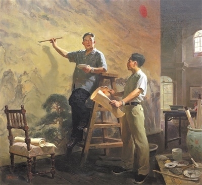 正在舉辦的第十四屆全國(guó)美術(shù)作品展覽進(jìn)京作品展上,撲面而來(lái)的藝術(shù)形象是腳踏中華大地的各族人民,是中國(guó)近現(xiàn)代文化史上的先賢圣哲,是和我們一道相擁而立的堂堂中國(guó)人。這些形象剛強(qiáng)勇毅,如潮如云,傳遞著眾志成城的精神力量,扣動(dòng)人心。譬如,呂鵬《山河頌》,以濃郁的色調(diào),再現(xiàn)傅抱石、關(guān)山月兩位前輩創(chuàng)作《江山如此多嬌》的情景,鐫刻新中國(guó)美術(shù)史上重要一幕;鄔大勇《我心中的英雄》塑造了畫家少年時(shí)代的英雄偶像——錢學(xué)森等一代科學(xué)家。還有許多氣勢(shì)宏大的創(chuàng)作,它們既是社會(huì)生活、時(shí)代精神的藝術(shù)載體,又是美術(shù)工作者面對(duì)歷史、面對(duì)人民的激情熔爐。這些作品以人民形象為根基,深植時(shí)代沃土,構(gòu)成歷史與現(xiàn)實(shí)相輝映的史詩(shī)畫卷。