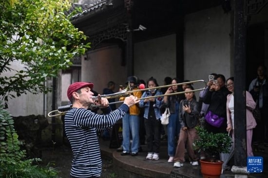 10月27日,來自瑞典的藝術(shù)表演者在南潯古鎮(zhèn)小蓮莊為游客演繹互動(dòng)音樂會(huì)。