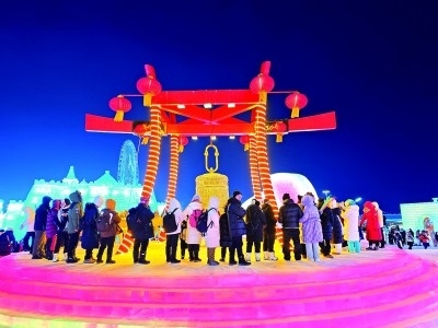 游客在哈爾濱冰雪大世界參加祈福活動。
