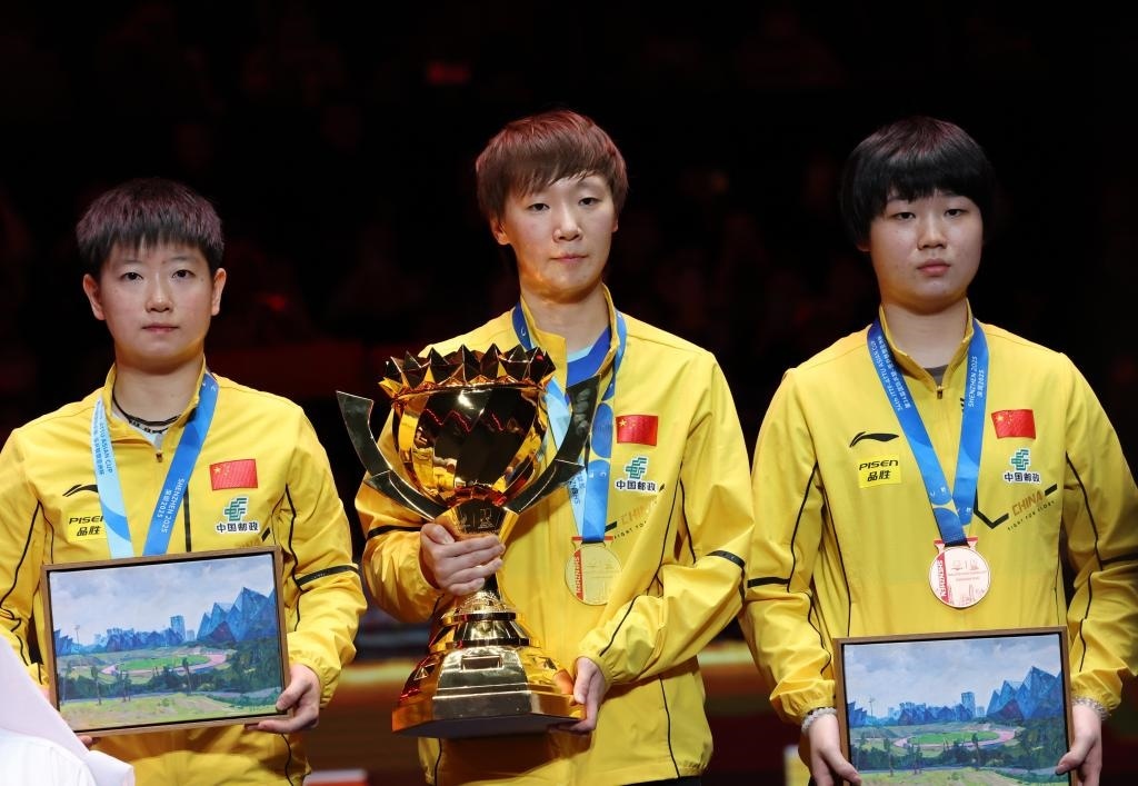 2月23日,冠軍王曼昱(中)、亞軍孫穎莎(左)和季軍蒯曼在頒獎儀式上合影。新華社記者 盧漢欣 攝