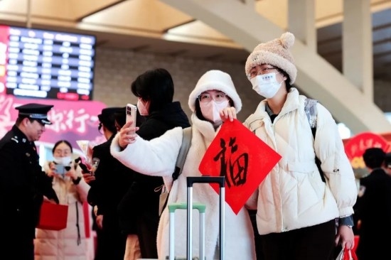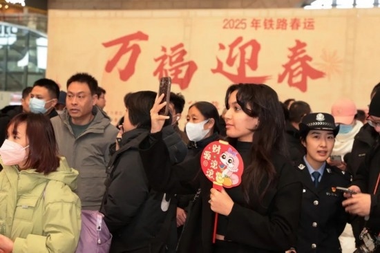 2025年鐵路春運(yùn)“萬福迎春”活動(dòng)現(xiàn)場(chǎng),一位外籍旅客自拍留念。