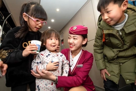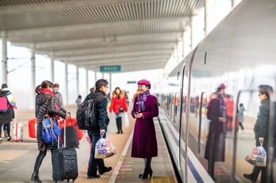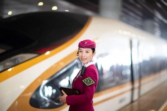 除夕當(dāng)天,復(fù)興號(hào)上的乘務(wù)員送出祝福。