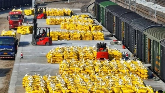 2月11日,石家莊鐵路物流中心辛集營(yíng)業(yè)部晉州貨場(chǎng)內(nèi),一袋袋化肥從棚車卸下,準(zhǔn)備運(yùn)往田間地頭。