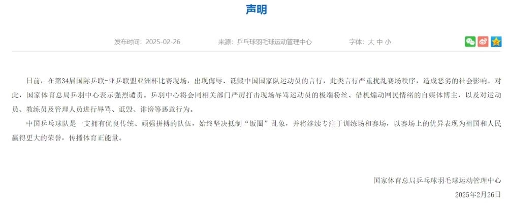 國(guó)家體育總局乒乓球羽毛球運(yùn)動(dòng)管理中心26日發(fā)布聲明,強(qiáng)烈譴責(zé)嚴(yán)重?cái)_亂第34屆國(guó)際乒聯(lián)-亞乒聯(lián)盟亞洲杯賽場(chǎng)秩序、造成惡劣社會(huì)影響的行為,并將會(huì)同相關(guān)部門(mén)進(jìn)行嚴(yán)厲打擊。