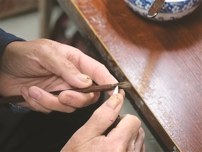 把毛料放在水中仔細(xì)清洗,就著燈光剔除一根根細(xì)微雜毛,將清理后的毛料聚合成圓直光滑、攏抱不散的錐形……走進(jìn)涇縣涇川鎮(zhèn)宣筆制作技藝代表性傳承人佘征軍的工作室,他正在為一支紫毫筆制作筆頭?!鞍拙右子性?shī)云,‘宣城之人采為筆,千萬(wàn)毛中揀一毫’。此句講的是宣筆制作工藝的復(fù)雜精細(xì)?!辟苷鬈娬f(shuō)。
