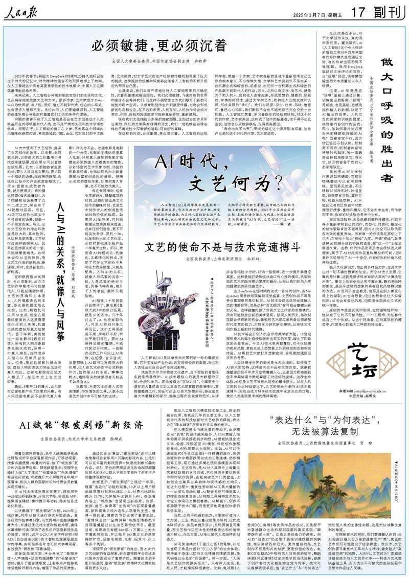 人工智能(AI)是科學(xué)技術(shù)發(fā)展到新一輪的最新變革,它不僅推動(dòng)產(chǎn)業(yè)升級(jí),改變傳統(tǒng)經(jīng)濟(jì)的面貌,而且對(duì)人類社會(huì)生活產(chǎn)生深遠(yuǎn)影響,也必將深刻地改變文藝和文學(xué)。文藝工作者應(yīng)該具備感知時(shí)代變革的能力,大膽學(xué)習(xí)研究新生事物,讓傳統(tǒng)藝術(shù)的創(chuàng)作插上新的時(shí)代翅膀。2025年全國兩會(huì)召開之際,本版約請(qǐng)全國人大代表、全國政協(xié)委員共同探討“AI時(shí)代,文藝何為?”這一話題,以饗讀者。
