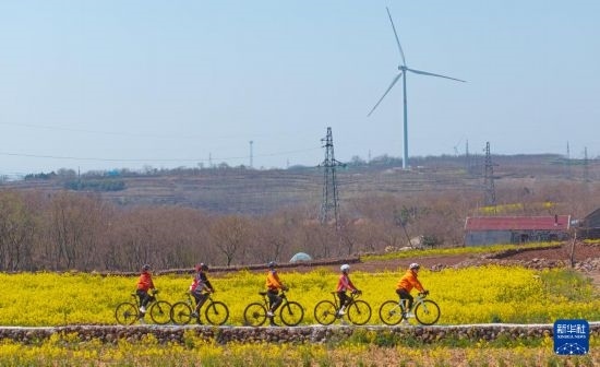 3月20日,騎行者在安徽省滁州市來安縣張山鎮(zhèn)的油菜田中拍照打卡。