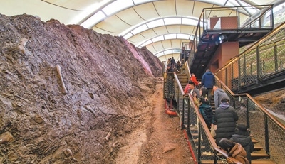 游客在重慶云陽世界地質公園參觀恐龍化石墻。