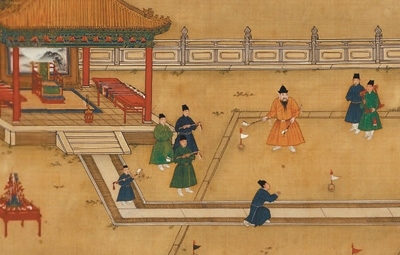 捶者,打也;丸者,球也。“不少學(xué)生剛接觸捶丸時(shí),說(shuō)它像現(xiàn)代的高爾夫。其實(shí),捶丸比高爾夫運(yùn)動(dòng)歷史更悠久?!逼巾斏綄W(xué)院陶瓷學(xué)院院長(zhǎng)梅國(guó)建介紹,捶丸源自唐代擊鞠(馬球)和步打球,傳至宋朝逐漸演變?yōu)橐来螕羟虻姆菍?duì)抗性比賽,名稱也變?yōu)榇吠瑁F(xiàn)藏于故宮博物院的《明宣宗行樂(lè)圖》中就描繪了宮中捶丸的場(chǎng)景。