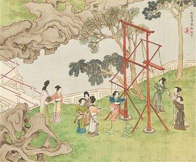 秋千,古稱“千秋”,可追溯至春秋時(shí)期,后改為“秋千”。據(jù)《荊楚歲時(shí)記》記載:“春時(shí)懸長(zhǎng)繩于高木,士女衣彩服坐于其上而推引之,名曰打秋千。”在古代,清明節(jié)更是有著秋千節(jié)的別稱,可見(jiàn)古人對(duì)春日蕩秋千的喜愛(ài)。