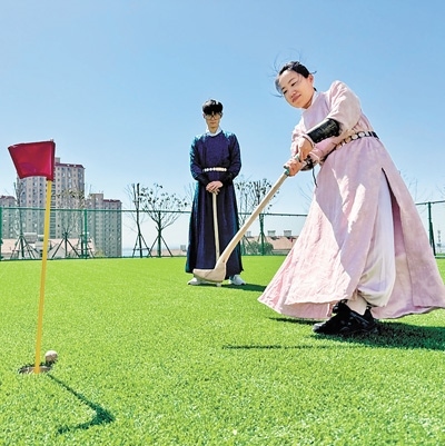 曲曉波(右)在體驗(yàn)捶丸。