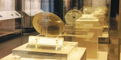 安徽蚌埠市博物館展出的漢代銅鏡。透過這枚銅鏡當(dāng)前的狀況,依稀能見到過去鏡面光可鑒人的效果。
