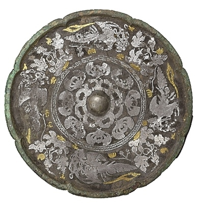 在金銀交相輝映下,這面銅鏡時(shí)至今日依然流光溢彩,其奧秘就在于“金銀平脫”工藝。即用金銀薄片裁成紋樣,粘貼于銅器漆面上,周邊再用漆涂滿,經(jīng)研磨拋光再鏨花,形成富麗堂皇、精麗雅致的藝術(shù)效果。它從最早出現(xiàn)于商代的金銀箔貼花技術(shù)演變而來,后經(jīng)歷了戰(zhàn)國、漢代較長時(shí)期的發(fā)展。到了唐代,工匠將“金銀平脫”創(chuàng)造性地運(yùn)用在銅鏡之上。